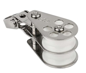 Cheeks are constructed of tumbled and polished stainless steel for maximum resistance to corrosion and cracking. Sheaves are made of tough, high-impact Delrin(R) and turn on polished, stainless steel spacers that prevent the cheeks from binding the sheave, even under heavy load.