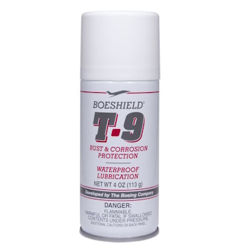T-9 was developed by The Boeing Co. for long-term protection of aircraft. Their research proved that none of the Teflon, silicone, or synthetic sprays held up for long when exposed to a corrosive environment. So they engineered a new product designed to: Penetrate deeply into fasteners and fixtures. Displace moisture and attack existing corrosion that will protect metals for months. Dry to a clean waxy film. It will also loosen rusty and corroded parts and is safe on paints, plastics and vinyls. Aerosol spray gets into cracks and crevices.