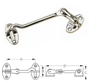These swivel-hinged hooks help to reduce rattling of latched doors. They are precision-cast in solid brass with a high-quality finish. Attachment bases are fastened at two countersunk holes with center-to-center distance of 1-3/16".