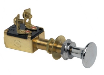 Normally OFF. Pull ON, spring return to OFF. Brass case and mounting hardware. Two brass screw terminals. Brass mounting stem 3/8"-32 x 1-1/4" (31.8mm) long. Fits panels up to 7/8" (22.2mm) thick. Chrome-plated brass knob, embossed "PULL," 7/8" (22.2mm) diameter.