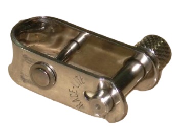 Spring-tension captive pin maintains steady pressure on sides of shackle under sailing conditions and allows easier opening for quick release.