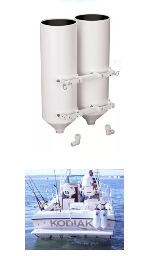 Tuna Tubes are supplied with quick-disconnect mounting brackets for transom mounting. The mounts use small transom mount nuts, and the tuna tube brackets clip to the nuts. The double tube set uses two sets of brackets mounted together and only requires 4 mounting nuts on transom. These mounts are anodized and white-powder coated for long life.