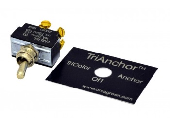 Toggle Reversing Switch Three-position toggle switch for two-wire operation of OGM LED Tri-Color/Anchor lights with black anodized faceplate that displays 3 positions: Tricolor - OFF - Anchor.