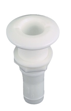 This Perko thru-hull connector is made of molded white plastic with a broad flange. This barb-ended fitting is designed for hose connection and not recommended for use below the waterline.