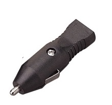 Cigarette lighter plug made of stamped brass with injection-molded Nylon and ABS. Uses solder-on connections.