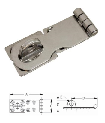 Stainless Fixed-Eye Safety Hasp Hasp construction of stamped 304 Stainless Steel. Measurements: A 2-11/16" B 2-1/16" C 1-1/16" D 11/16" E 5/16" Each hasp requires #5 FH fasteners - (not included.) Sold individually