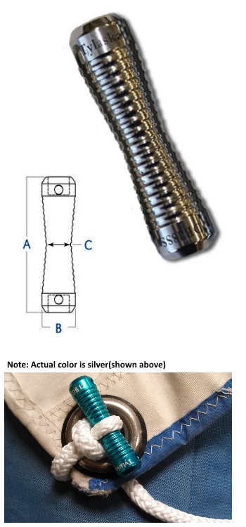 A dog bone is a short, structural rod that can be attached to the end of a line. It's used like a button or toggle to make a connection to another line, grommet or deck fitting. The tapered middle and symmetric ends make the part look like a bone, hence the name "dogbone."